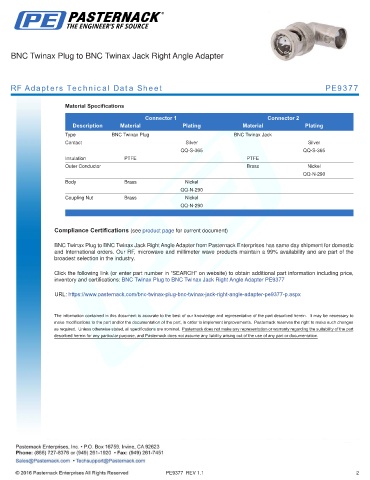 inventory and certifications: BNC Twinax Plug to BNC Twinax Jack Right Angle Adapter PE9377
