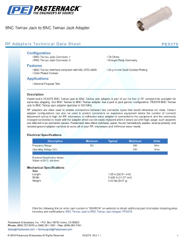 Pasternack’s PE9378 BNC Twinax jack to BNC Twinax jack adapter is part of our full line of RF components available for