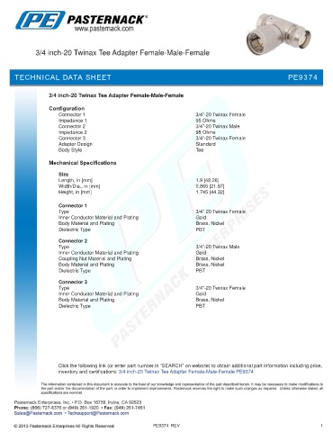 inventory and certifications: 3/4 inch-20 Twinax Tee Adapter Female-Male-Female PE9374