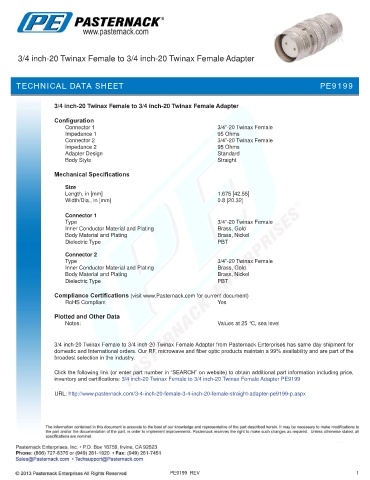 inventory and certifications: 3/4 inch-20 Twinax Female to 3/4 inch-20 Twinax Female Adapter PE9199