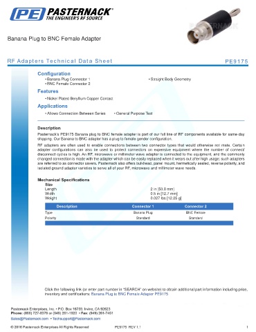 inventory and certifications: Banana Plug to BNC Female Adapter PE9175