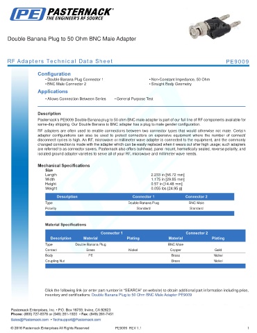 Pasternack’s PE9009 Double Banana plug to 50 ohm BNC male adapter is part of our full line of RF components available for