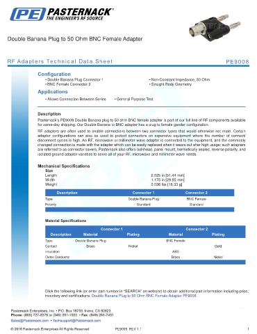inventory and certifications: Double Banana Plug to 50 Ohm BNC Female Adapter PE9008