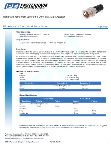 Pasternack’s PE9169 Banana Binding Post jack to 50 ohm BNC male adapter is part of our full line of RF components