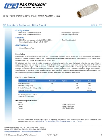 Pasternack’s PE91107 BNC Triax female to BNC Triax female adapter is part of our full line of RF components available for