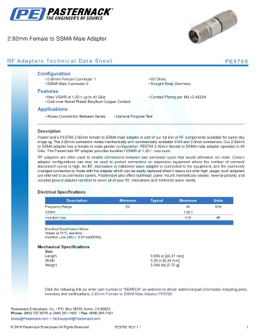 inventory and certifications: 2.92mm Female to SSMA Male Adapter PE9768