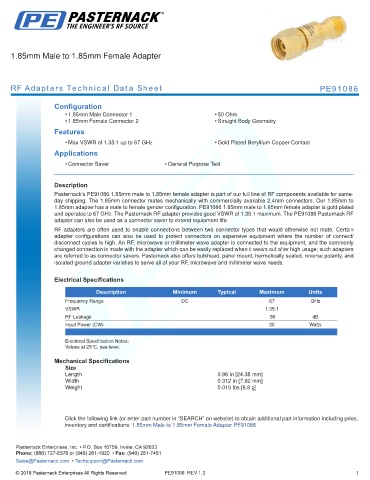 and operates to 67 GHz. The Pasternack RF adapter provides good VSWR of 1.35:1 maximum. The PE91086 Pasternack RF