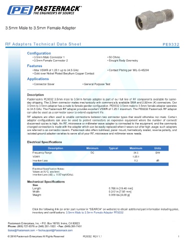 to 34.5 GHz. The Pasternack RF adapter provides excellent VSWR of 1.25:1 maximum. The PE9332 Pasternack RF adapter