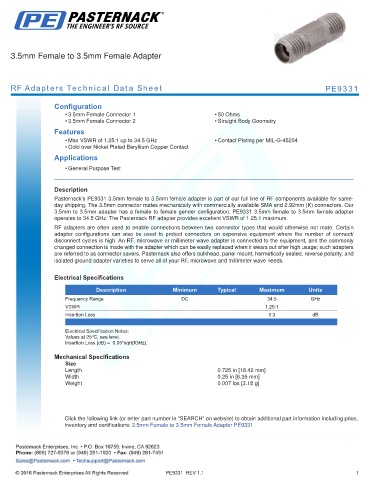 operates to 34.5 GHz. The Pasternack RF adapter provides excellent VSWR of 1.25:1 maximum.