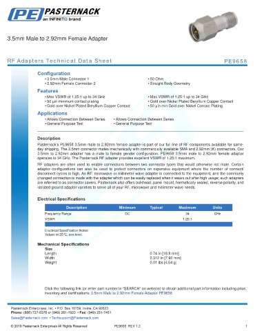 inventory and certifications: 3.5mm Male to 2.92mm Female Adapter PE9658