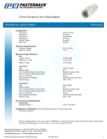 inventory and certifications: 3.5mm Female to 2.4mm Male Adapter PE91292