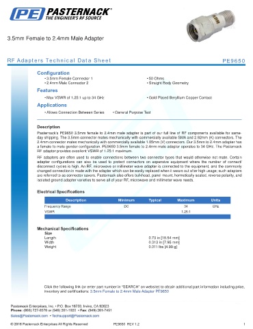 inventory and certifications: 3.5mm Female to 2.4mm Male Adapter PE9650