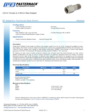 inventory and certifications: 3.5mm Female to 2.92mm Male Adapter PE9659