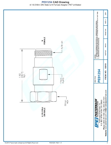 PE91254 CAD Drawing 4.1/9.5 Mini DIN Male to N Female Adapter IP67 UnMated © 2014 Pasternack Enterprises All Rights Reserved PE91254 REV 1.0 3