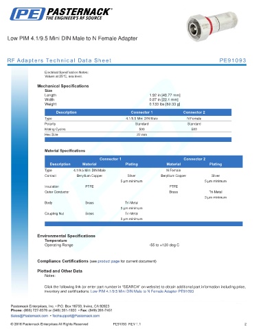 inventory and certifications: Low PIM 4.1/9.5 Mini DIN Male to N Female Adapter PE91093