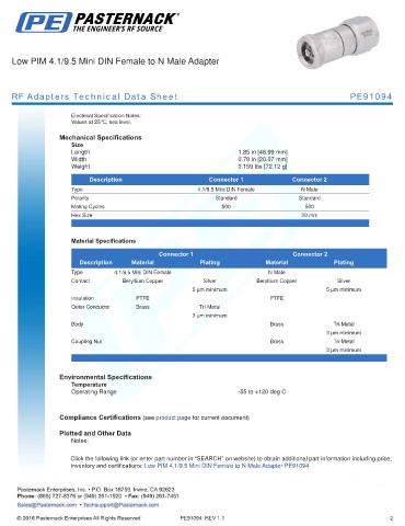 inventory and certifications: Low PIM 4.1/9.5 Mini DIN Female to N Male Adapter PE91094