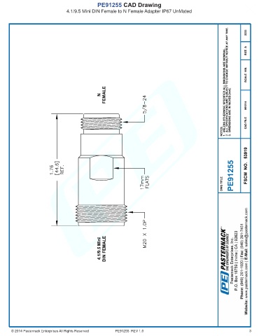 PE91255 CAD Drawing 4.1/9.5 Mini DIN Female to N Female Adapter IP67 UnMated © 2014 Pasternack Enterprises All Rights Reserved PE91255 REV 1.0 3