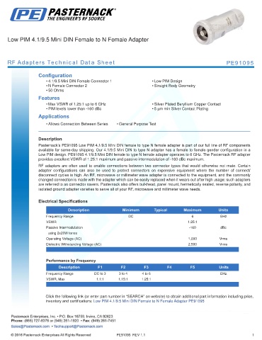inventory and certifications: Low PIM 4.1/9.5 Mini DIN Female to N Female Adapter PE91095