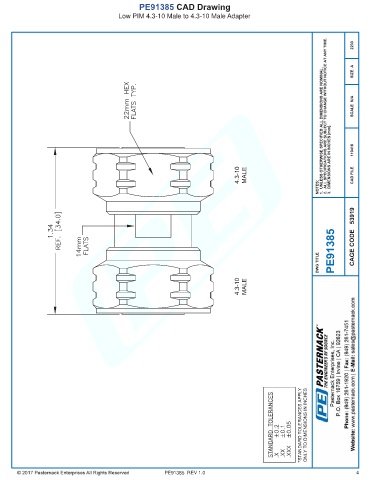 PE91385 CAD Drawing Low PIM 4.3-10 Male to 4.3-10 Male Adapter PE91385 REV 1.0 4