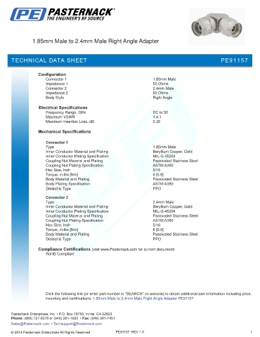 inventory and certifications: 1.85mm Male to 2.4mm Male Right Angle Adapter PE91157