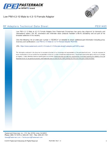 any representation or warranty regarding the suitability of the part described herein for any particular purpose, and Pasternack does not assume any liability arising out of the use of any part or documentation.