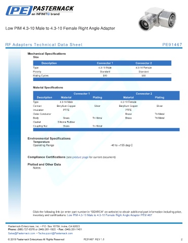 inventory and certifications: Low PIM 4.3-10 Male to 4.3-10 Female Right Angle Adapter PE91467