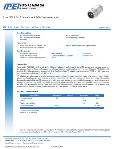 any representation or warranty regarding the suitability of the part described herein for any particular purpose, and Pasternack does not assume any liability arising out of the use of any part or documentation.