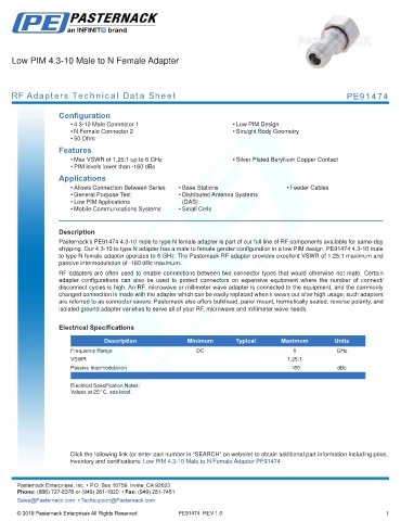 inventory and certifications: Low PIM 4.3-10 Male to N Female Adapter PE91474