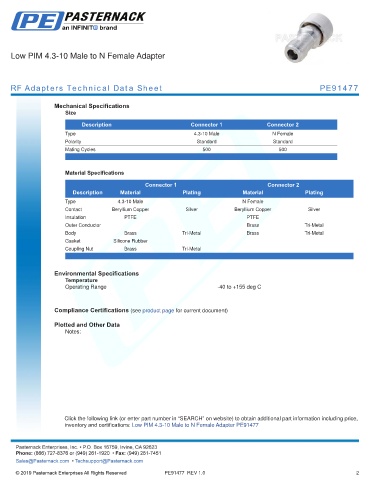 inventory and certifications: Low PIM 4.3-10 Male to N Female Adapter PE91477