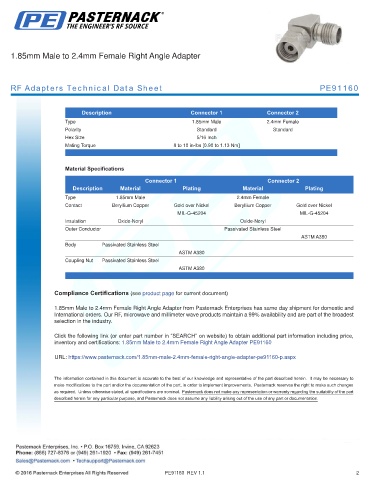 inventory and certifications: 1.85mm Male to 2.4mm Female Right Angle Adapter PE91160