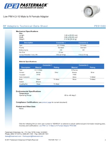 inventory and certifications: Low PIM 4.3-10 Male to N Female Adapter PE91389