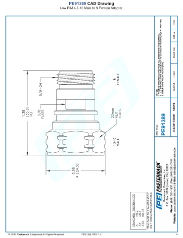 PE91389 CAD Drawing Low PIM 4.3-10 Male to N Female Adapter PE91389 REV 1.0 4