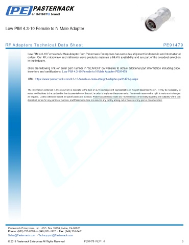 any representation or warranty regarding the suitability of the part described herein for any particular purpose, and Pasternack does not assume any liability arising out of the use of any part or documentation.