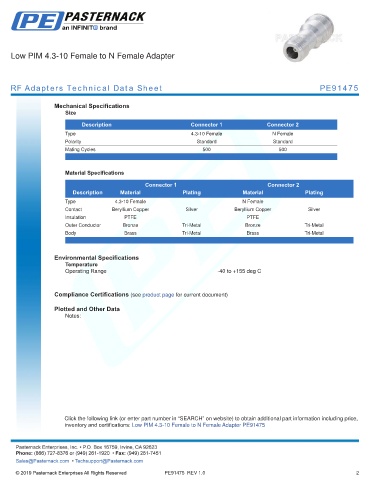 inventory and certifications: Low PIM 4.3-10 Female to N Female Adapter PE91475