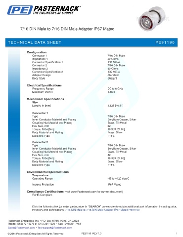 inventory and certifications: 7/16 DIN Male to 7/16 DIN Male Adapter IP67 Mated PE91190