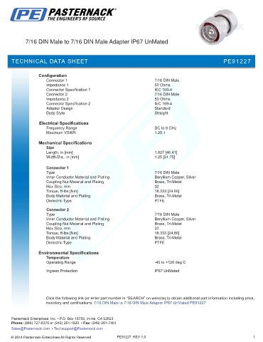 inventory and certifications: 7/16 DIN Male to 7/16 DIN Male Adapter IP67 UnMated PE91227