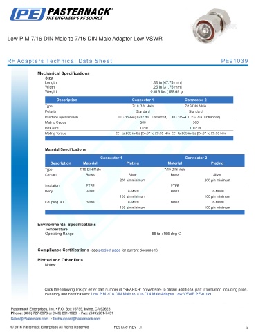 inventory and certifications: Low PIM 7/16 DIN Male to 7/16 DIN Male Adapter Low VSWR PE91039