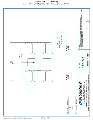 PE91039 CAD Drawing Low PIM 7/16 DIN Male to 7/16 DIN Male Adapter Low VSWR PE91039 REV 1.1 4