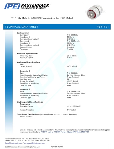 inventory and certifications: 7/16 DIN Male to 7/16 DIN Female Adapter IP67 Mated PE91191