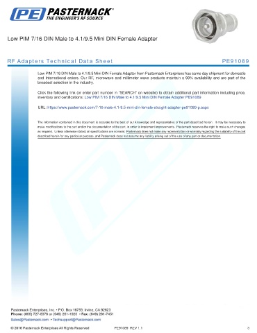 inventory and certifications: Low PIM 7/16 DIN Male to 4.1/9.5 Mini DIN Female Adapter PE91089
