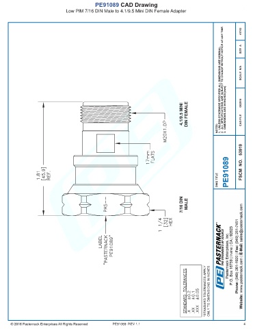PE91089 CAD Drawing Low PIM 7/16 DIN Male to 4.1/9.5 Mini DIN Female Adapter PE91089 REV 1.1 4