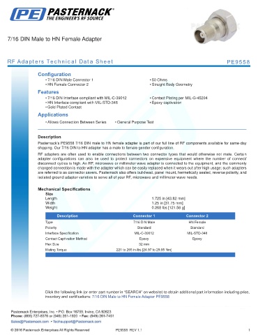 inventory and certifications: 7/16 DIN Male to HN Female Adapter PE9558
