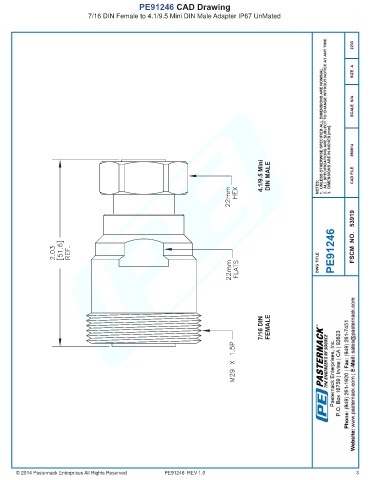 PE91246 CAD Drawing 7/16 DIN Female to 4.1/9.5 Mini DIN Male Adapter IP67 UnMated © 2014 Pasternack Enterprises All Rights Reserved PE91246 REV 1.0 3
