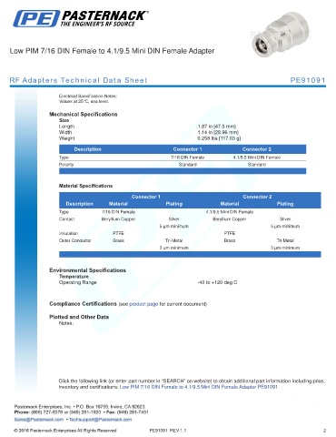 inventory and certifications: Low PIM 7/16 DIN Female to 4.1/9.5 Mini DIN Female Adapter PE91091