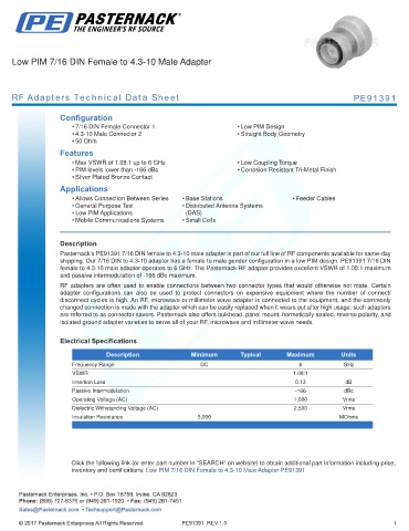 inventory and certifications: Low PIM 7/16 DIN Female to 4.3-10 Male Adapter PE91391
