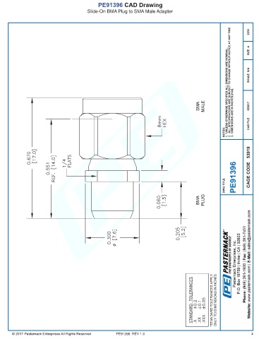 PE91396 CAD Drawing Slide-On BMA Plug to SMA Male Adapter PE91396 REV 1.0 4