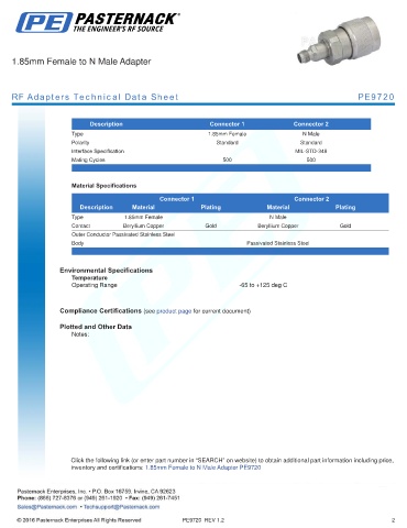 inventory and certifications: 1.85mm Female to N Male Adapter PE9720