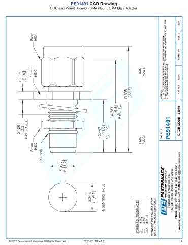 PE91401 CAD Drawing Bulkhead Mount Slide-On BMA Plug to SMA Male Adapter PE91401 REV 1.0 4