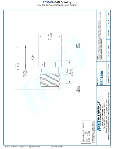 PE91400 CAD Drawing Slide-On BMA Jack to SMA Female Adapter PE91400 REV 1.0 4