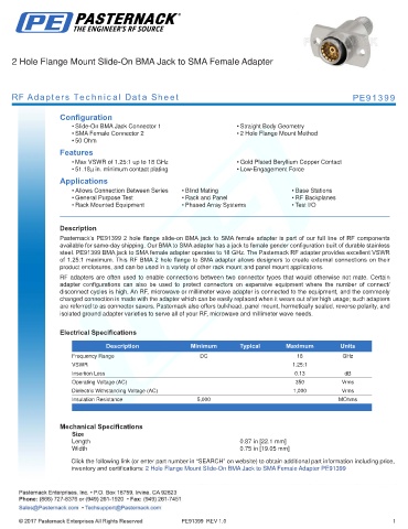 Pasternack’s PE91399 2 hole flange slide-on BMA jack to SMA female adapter is part of our full line of RF components